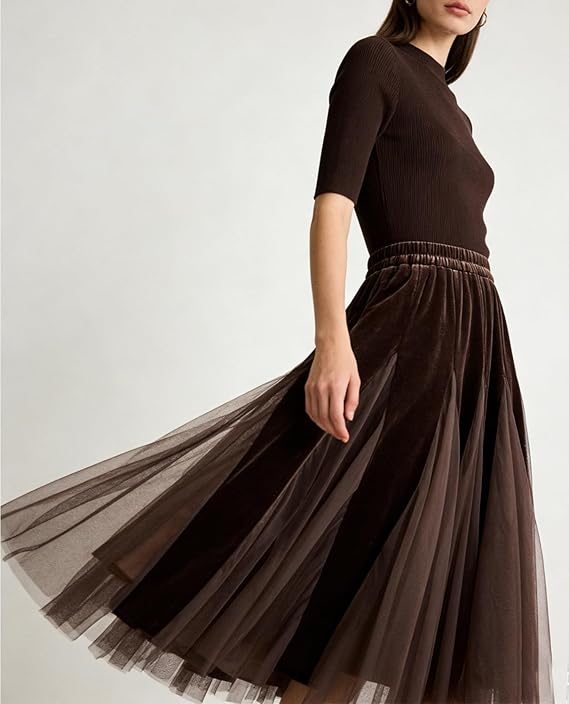 • Pleated skirts for women, made of velet and tulle material, it has a soft and delicate touch with a gentle and natural luster, showcasing a luxurious texture.
